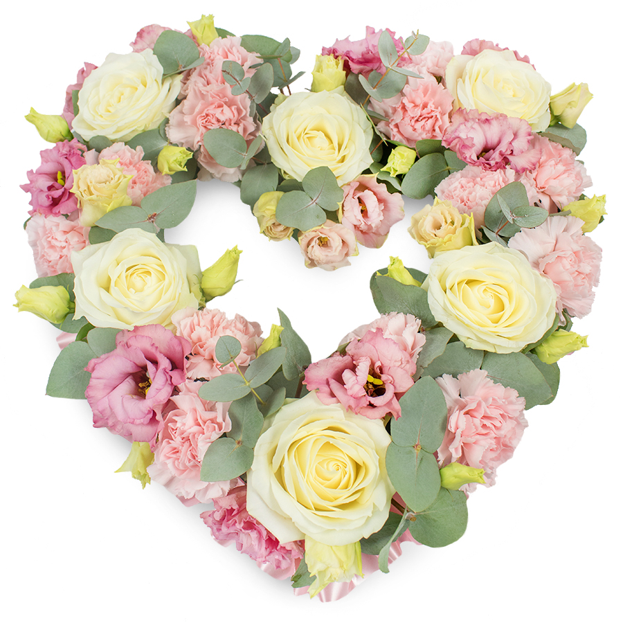 Celebrate love and remembrance with our charming heart tribute flower bouquet. This elegant arrangement features white roses, pink carnations, pink lisianthus, and eucalyptus leaves, beautifully combined to create a lasting impression.